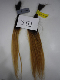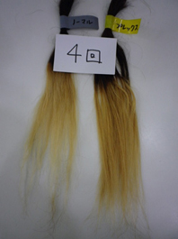 | 左は未処理毛、右は処理毛。 | ブリーチ1回目 | ブリーチ2回目。処理毛はブリーチ力が抑えられるものの、パサつきも抑えられています。 |