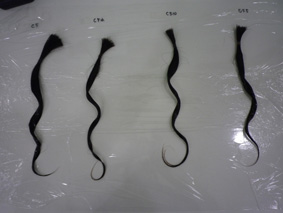 未処理毛は切れ毛をおこして毛先がスカスカになっています。それに対して処理毛はダメージはありますが、だいぶ抑えられています。 |