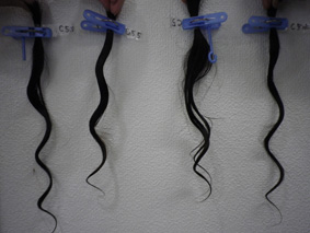 ヒートパーマで温度の違いによる違いを検証しています。 右側は低い温度、左側は段階的に温度を上げていき、仕上がりのウェーブの違いを検証しています。 |